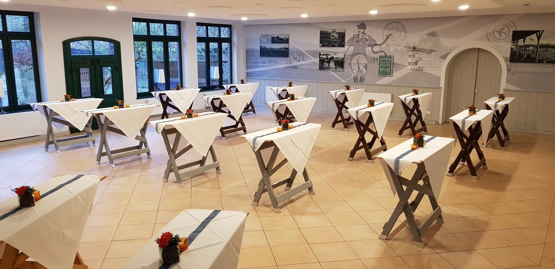 Große Gesellschaften bis 150 Personen begrüßen wir in unserem großen Festsaal mit direktem Zugang zum Außenbereich, in dem wir seit 2018 auch freie Trauungen durchführen können. Helle Farben und modern interpretierte Bilder erzählen hier die Geschichte des Hauses an der alten Rennbahn. Der schöne Blick ins Grüne rundet das Bild ab.